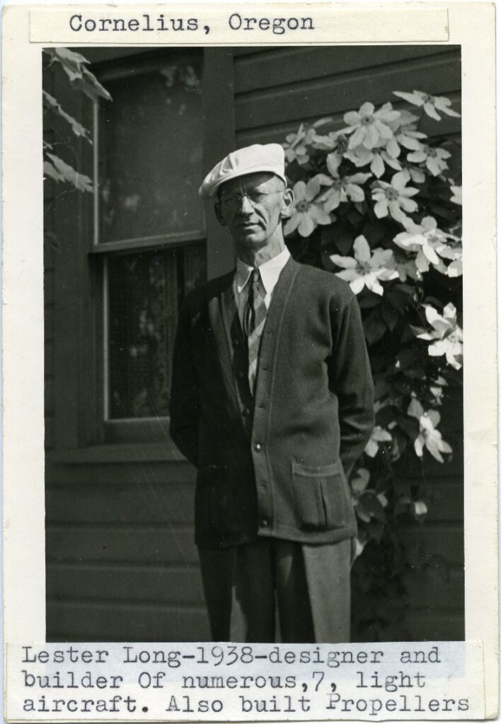 Long advertised a local air service, from his farm airstrip in Cornelius, in 1935 with Ed Ball as the head pilot.[10] Ball, who had license #5 issued by the Oregon State Board of Aeronautics, used a Salmson powered American Eaglet, a certificated airplane, to give flight instruction. Locals Jerry and Dick VanGrunsven, Phil Duyck and Phil Brown, said Les used his private airstrip to test his various designs,[11] and that Long’s strip was a gathering place for amateur builders and fliers (communication with author, December 2024, and June 2025).[4]