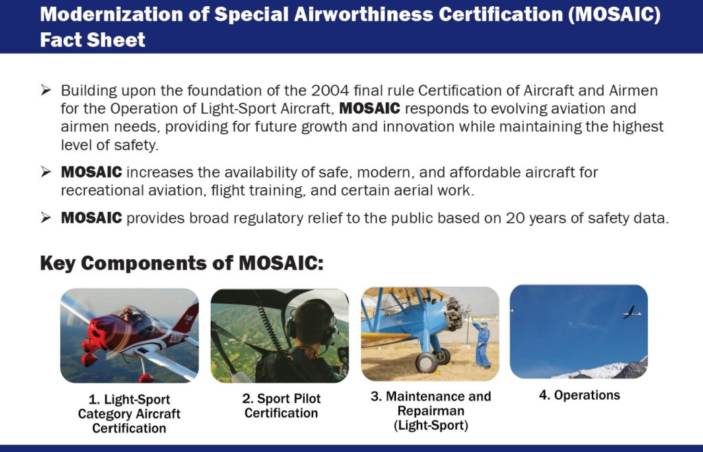 The FAA has published a MOSAIC Fact Sheet that will hopefully answer some questions about the many changes resulting from the new MOSAIC effects on the FAA Regulations.
